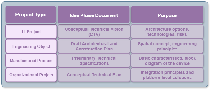 At the conceptual stage of a project (before design and implementation), only one preliminary document is prepared, depending on the project type: