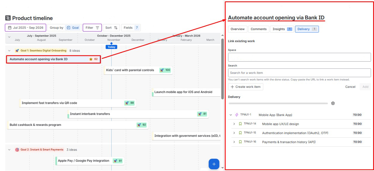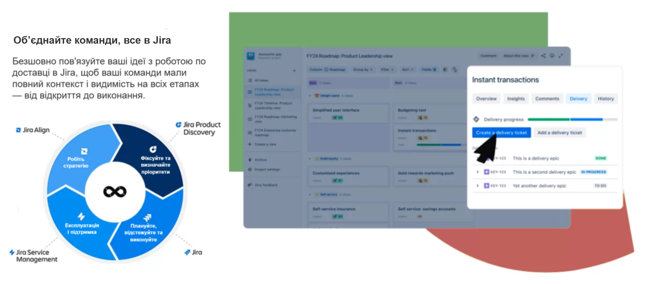 - Пов’язуйте свої високорівневі ідеї, фічі та можливості з Jira Product Discovery з фактичними задачами для доставки в Jira Software.