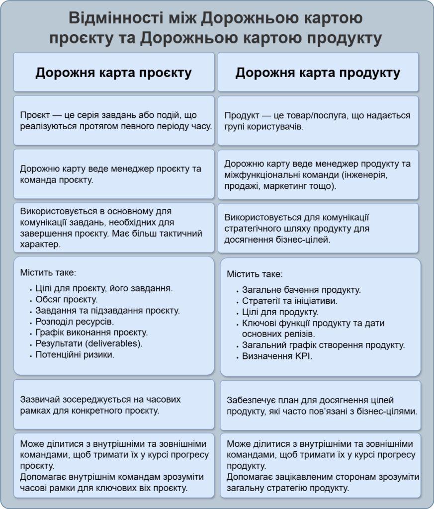 На відміну від продуктової, дорожня карта проєкту фокусується на організації процесу реалізації: поділ на етапи, визначення залежностей, терміни виконання та контроль завершення. Обидві карти — продуктова й проєктна — доповнюють одна одну, формуючи єдине бачення.
