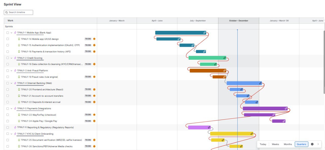 - Використовуйте Sprint View, щоб побудувати Project Roadmap,де відображені всі епіки, задачі та робочі потоки, що формують проєктну доставку.Це дає цілісне бачення того, як різні технічні та бізнес-потоки просуваються в часі.