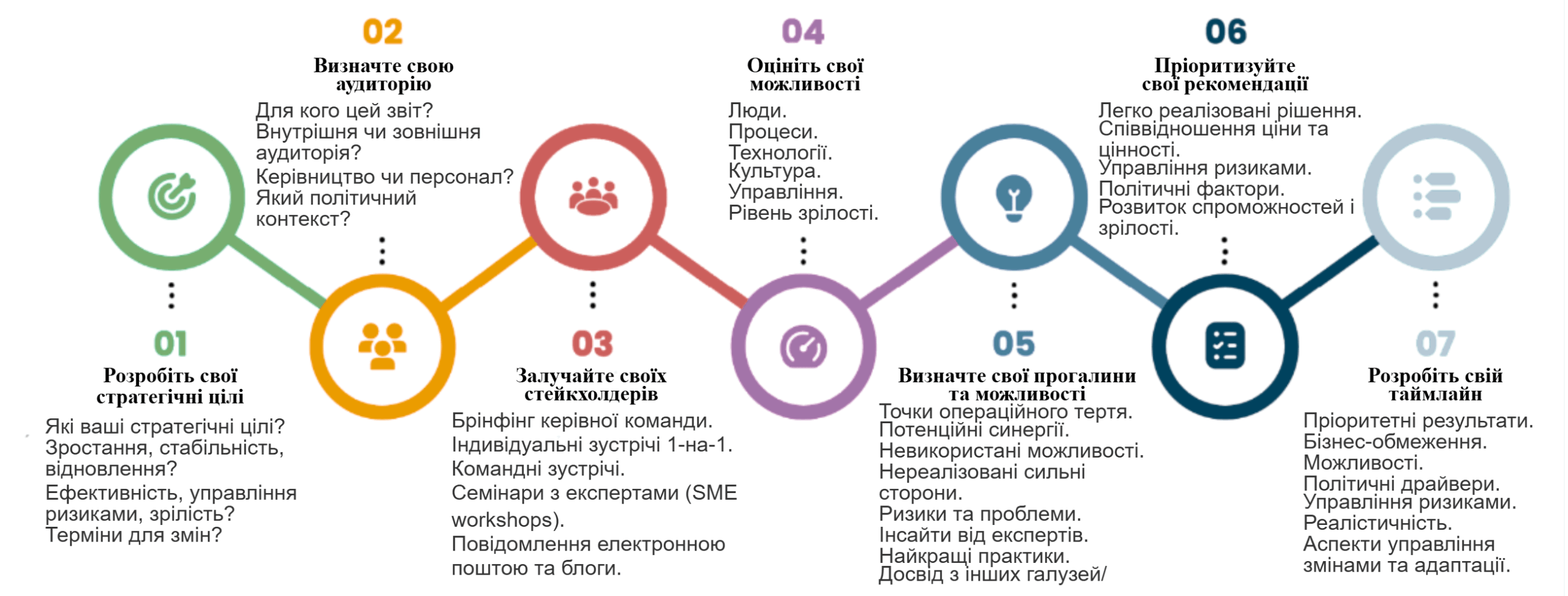 - На першому етапі команди повинні чітко окреслити цілі проєкту — наприклад, стабільність, зростання або антикризове управління. Ці цілі становлять основу дорожньої карти та спрямовують зусилля команди на довгострокові завдання.