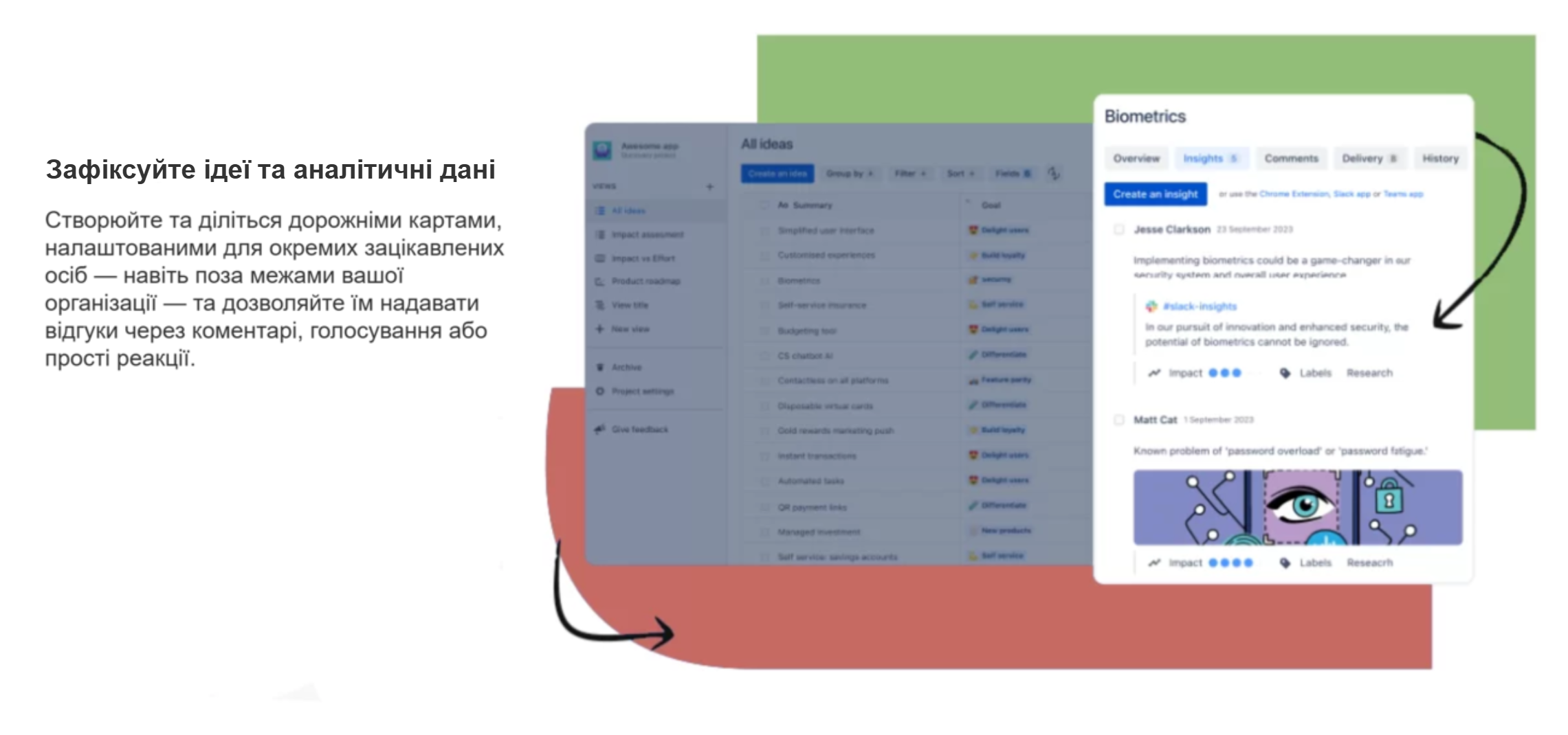 - Централізуйте всі ранні Discovery – входи, збираючи інсайти з інтерв’ю, досліджень і відгуків користувачів. Структуруйте та класифікуйте ці інсайти, щоб команда могла легко виявляти патерни, перевіряти припущення та знаходити важливі можливості для покращення продукту.