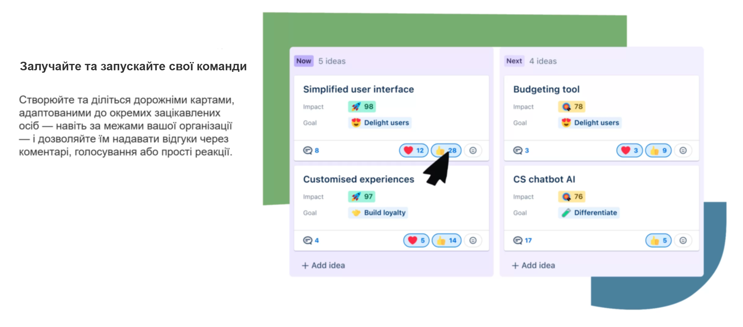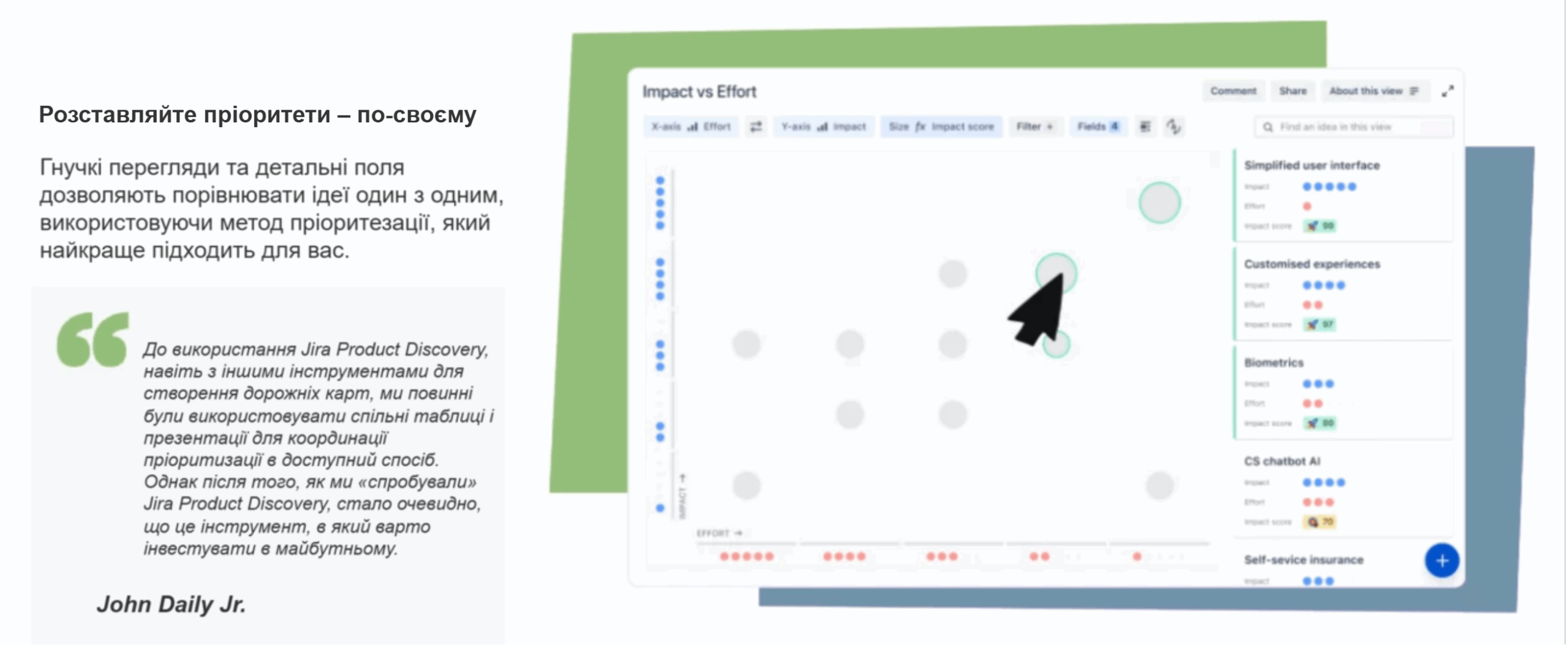 Використовуйте поля Impact / Effort, Confidence, RICE, а також Team Voting — доступно «з коробки».