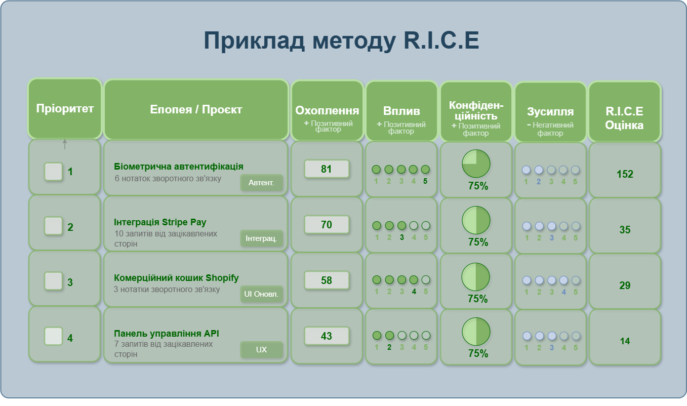 RISE = {Охоплення (Reach × Вплив (Impact) × Упевненість (Confidence) \above{1pt} Зусилля (Effort)}