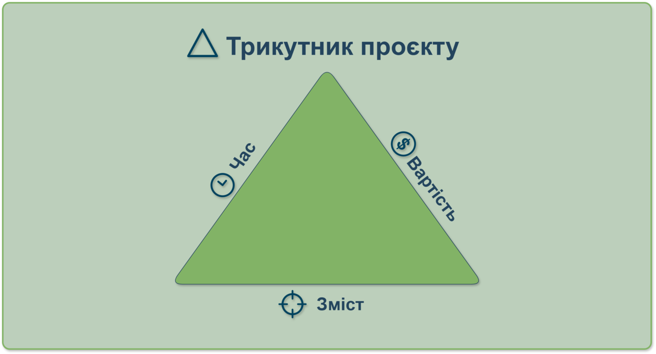 У серці кожного проєкту лежить трикутник — час, вартість і зміст. Цей трикутник регулює всі процеси, визначаючи, що буде створено, у які терміни та за якою вартістю.