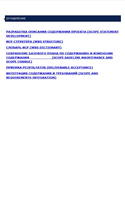 — описує процес управління змінами у змісті, а також методи погодження та затвердження таких змін. Визначається, як буде підтримуватись базова лінія (еталон) змісту.