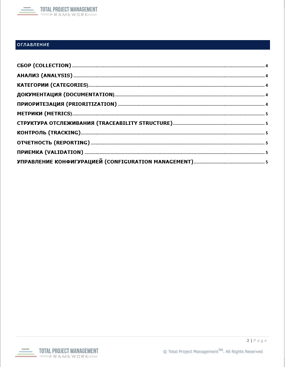 Цей документ допомагає структурувати процес збору, аналізу та документування вимог. Варто зазначити, що вимоги проєкту визначають ключові результати, яких очікують зацікавлені сторони. Матриця трасування вимог (Requirements Traceability Matrix, RTM) пов’язує вимоги з виконаними завданнями, забезпечуючи прозорість на всіх етапах реалізації проєкту.